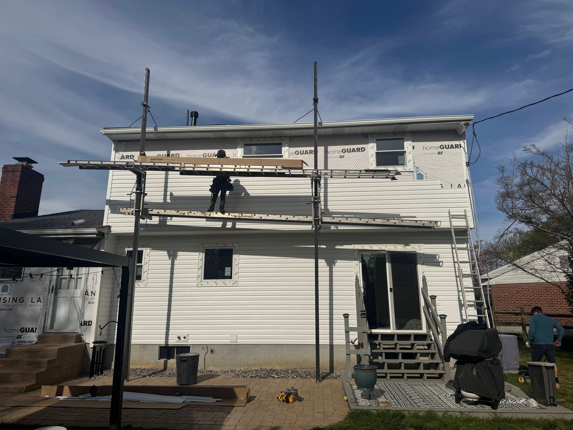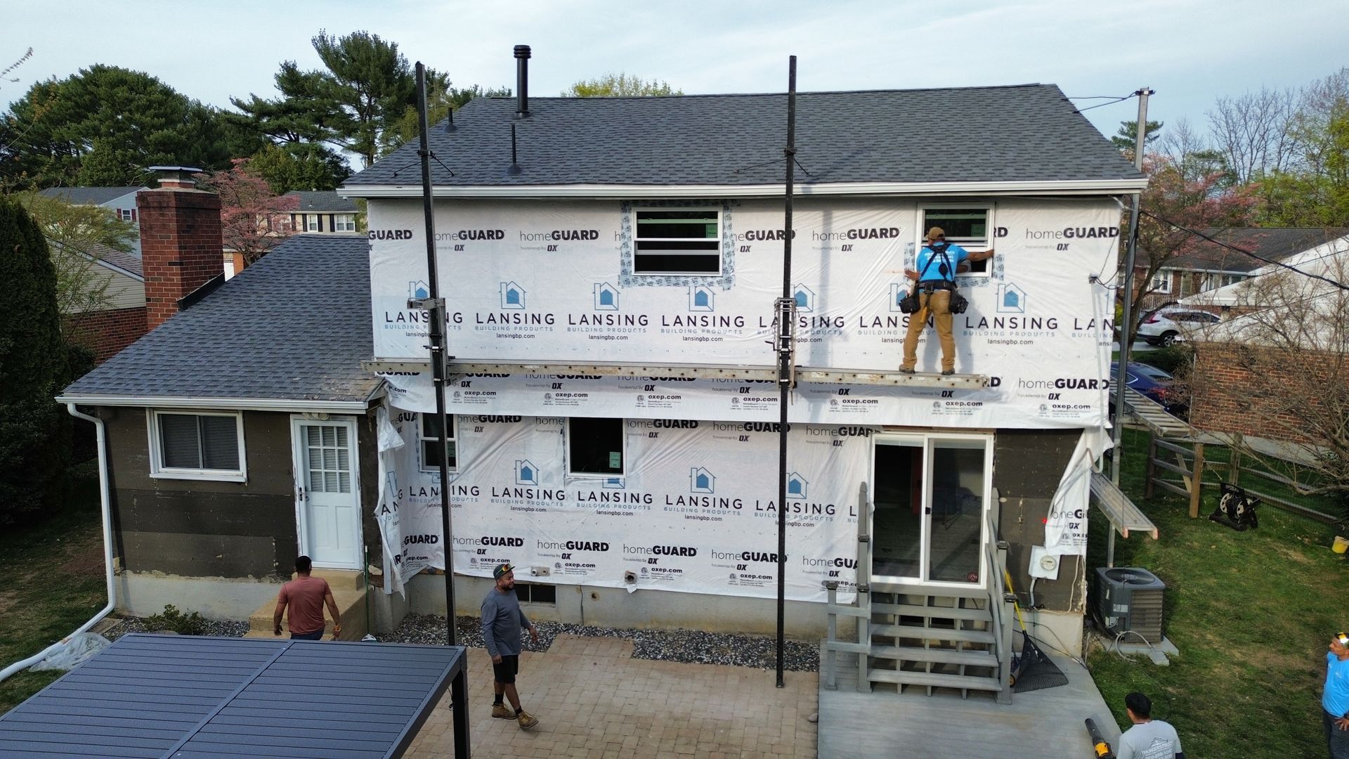 We install proper housewrap and flashing to protect against water intrusion. Corners, starter strips, and framing details are set for structural alignment.